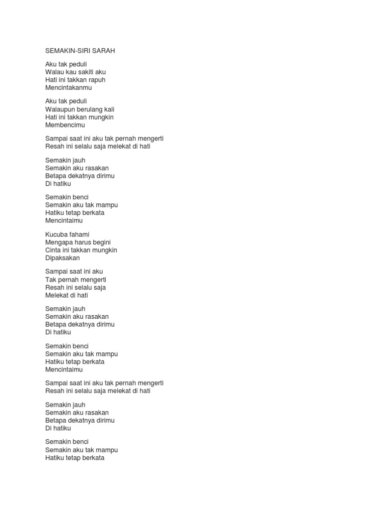 Uisss aku sekarang ni suka sangat dok dengar lagu Semakin nyanyian Siti Sarah. Lirik Lagu Semakin - Siti Sarah Hi Readerssss. Allahyarhamah Sarah meninggal dunia akibat Covid-19 pada 9 Ogos 2021 selepas melahirkan anak keempatnya Ayash Affan.